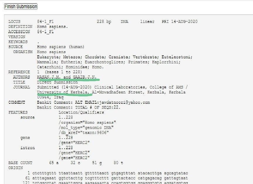 وبين ان هذه اول رسالة ماجستير في علوم الادلة الجنائية في العراق ويسجل من خلالها ٧, لم تسجل سابقا عالميا وتم تسجيلها في قاعدة البيانات NCBI باسم الباحث والكلية وجامعة كربلاء.