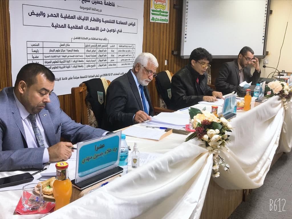 You are currently viewing جامعة كربلاء تناقش رسالة الماجستيرالموسومة ( قياس المساحة التنفسية واقطار الالياف العضلية الحمر والبيض في نوعين من الاسماك العظمية المحلية)