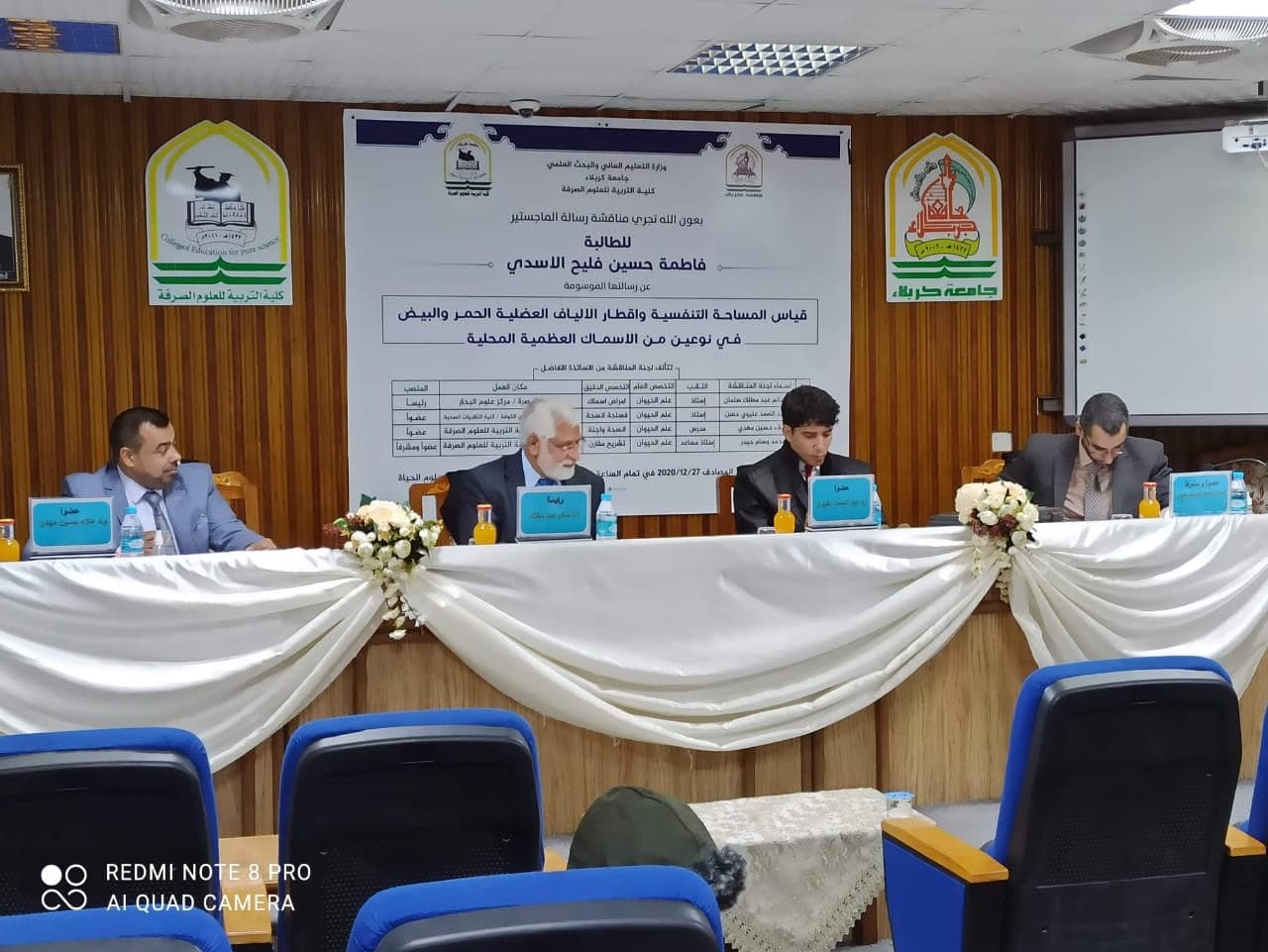 جرى بكلية التربية للعلوم الصرفة في جامعة كربلاء مناقشة رسالة الماجستير الموسومة (قياس المساحة التنفسية واقطار الالياف العضلية الحمر والبيض في نوعين من الاسماك العظمية المحلية) ,