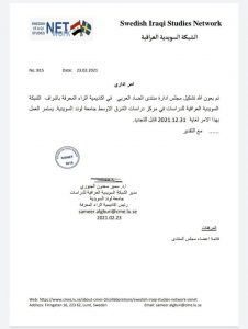 وفي الوقت نفسه اصدرت الشبكة السويدية العراقية للدراسات –جامعة لوند السويدية قرار بتكليف التدريسية في كلية العلوم الاسلامية قسم اللغة العربية الاستاذ الدكتور رفاه عبد الحسين الفتلاوي كنائبة لرئيسة مجلس ادارة منتدى الضاد العربي في اكاديمية اثراء المعرفة التي تشرف عليها الشبكة السويدية العراقية للدراسات في مركز دراسات الشرق الاوسط جامعة لوند السويدية .