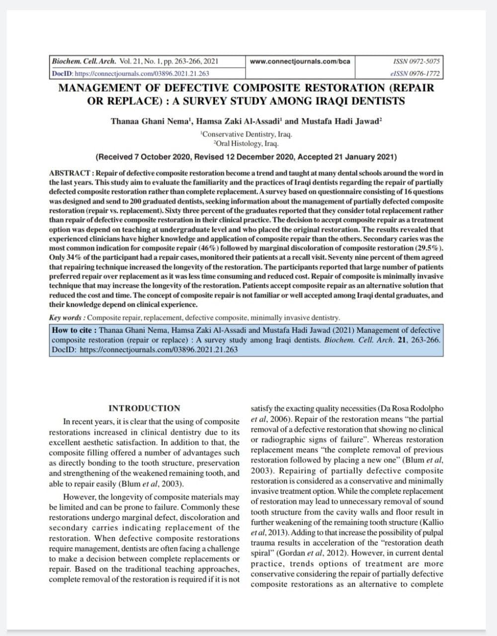 a survey study among Iraqi dentists). في مجلة ((Biochemical and cellular archives , وبمشاركة 200 طبيب اسنان عراقي من جامعات مختلفة