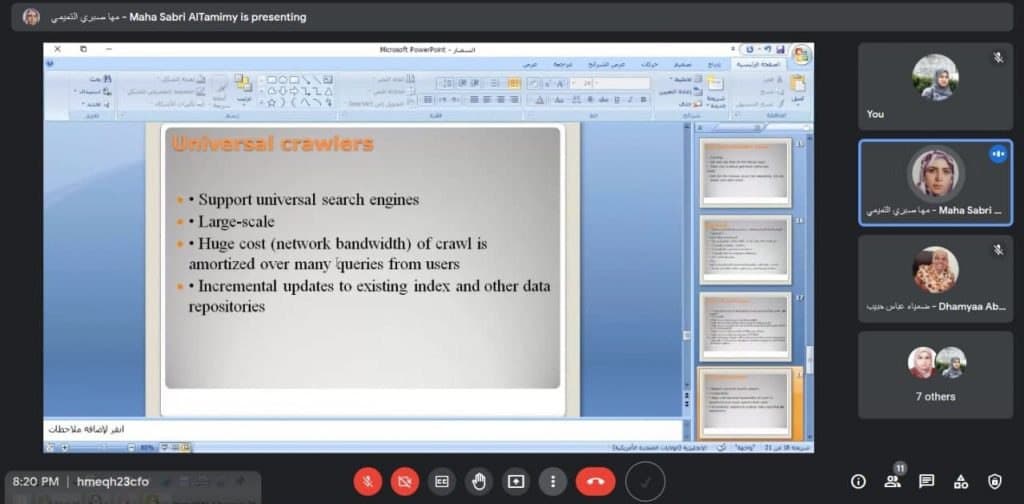 نظمت كلية علوم الحاسوب وتكنولوجيا المعلومات في جامعة كربلاء حلقة نقاشية الكترونية بعنوان (خوارزمية crawler الأساسية ) , بمشاركة باحثين ومختصين من داخل وخارج الجامعة ,