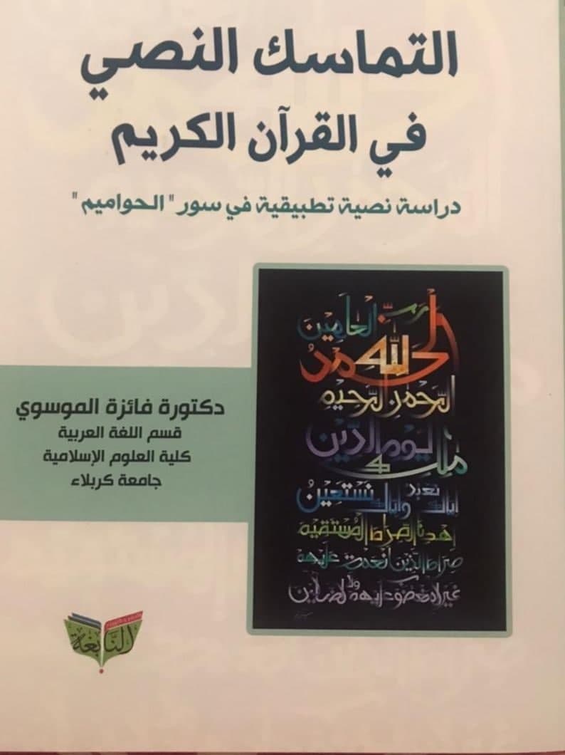 اصدرت التدريسية في كلية العلوم الاسلامية بجامعة كربلاء الدكتورة فائزة الموسوي ، كتاب عن التماسك النصي في القرآن الكريم- دراسة نصية تطبيقية في سور الحواميم .