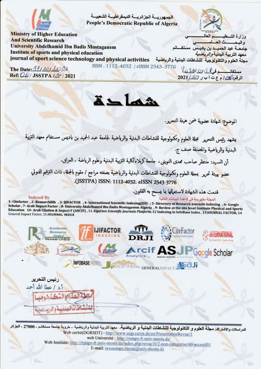 اختارت مجلة عربية رصينة التدريسي بكلية التربية البدنية وعلوم الرياضة بجامعة كربلاء الدكتور منتظر صاحب مهدي النويني لعضوية تحرير مجلة (العلوم التكنولوجية للنشاطات البدنبة والرياضية) بجامعة عبد الحميد بن باديس مستغانم معهد التربية البدنية في جمهورية الجزائر الديمقراطية الشعبية كمقوم علمي لها.