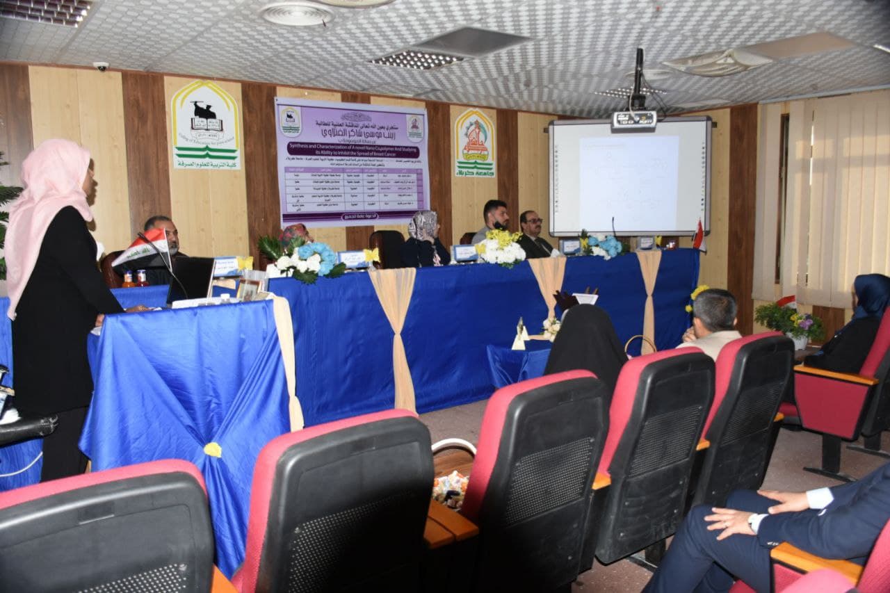 ناقشت كلية التربية للعلوم الصرفة في جامعة كربلاء رسالة الماجستير الموسومة (تحضير وتشخيص بوليمر نانوي مشترك جديد ودراسة قابليته على تثبيط انتشار سرطان الثدي) للطالبة زينب موسى شاكر الفتلاوي , وباشراف أ.د. محمد ناظم بهجت .