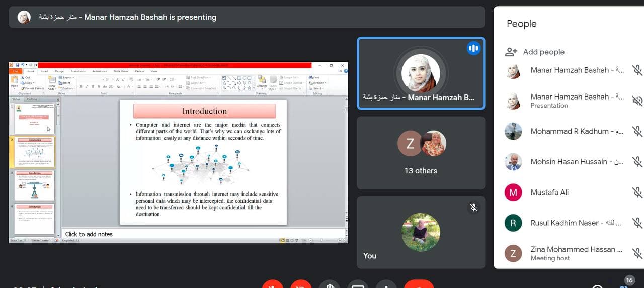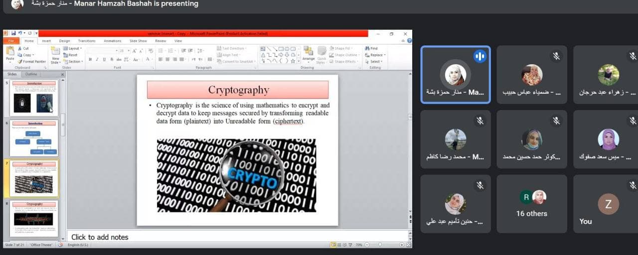اقامت كلية علوم الحاسوب وتكنولوجيا المعلومات في جامعة كربلاء حلقة نقاشية الكترونية بعنوان Data security using Cryptography and Steganography techniques قامت بالقائها التدريسية في قسم تكنلوجيا المعلومات ( م.م منار حمزة) . بمشاركة مجموعة من الأساتذة المختصين بامن البيانات من السادة التدريسيين والتدريسييات