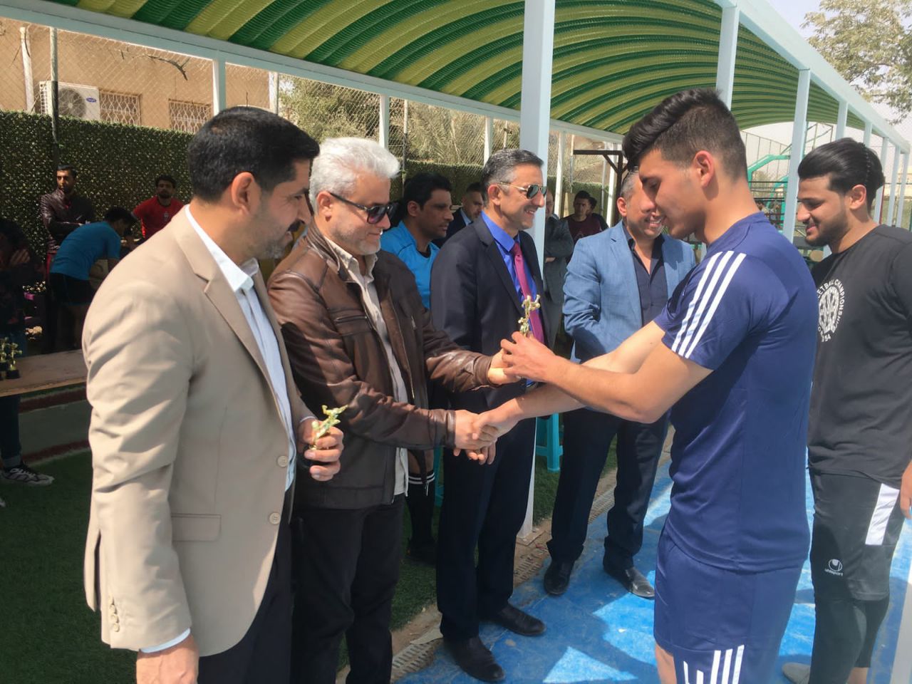 وفي ختام المباراة جرى توزيع الجوائز على الفريقين فيما قدم عميد كلية طب الاسنان الأستاذ الدكتور مهند صلاح عبد الستار درع الكلية للسيد عميد كلية التربية البدنية الاستاذ الدكتور حبيب علي طاهر تثمينا لجهوده الكبيرة لدعم الانشطة الرياضية وتفانيه بالعمل الاكاديمي والاداري خدمة للمسيرة العلمية والتعليمية بالبلاد .
