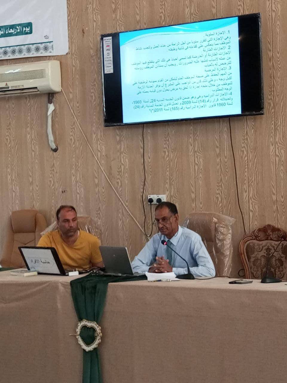 اقامت كلية الزراعة في جامعة كربلاء دورة تدريبية بعنوان ( حقوق وواجبات الموظف العام في القوانين والأنظمة النافذة والعقوبات وآثارها والحماية القانونية الموظف العام) حاضر فيها كل من الاستاذ المساعد الدكتور خضير ياسين خضير والسيد بهاء عبدالحسين .