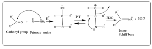 قاعدة شف هي المركبات العضوية الحاوية على مجموعة الازوميثين ( (C = N- ) (Azomethien ) (1حضرت لأول مرة عام ( 1864 ) من قبل العالم شف بعملية تكاثف الالديهايدات أو الكيتونات مع الامينات الأولية الاليفاتية أو الاروماتية (2) . و لها العديد من التسميات ، منها الايمينات ( Imines ) وكذلك عندما تشتق من الكيتون تسمى الكيتمينات (3 ketimines ) () وعندما تشتق من الألديهايد تسمى الالدمينات ( Aldimines ) والتي تحضر عن طريق تفاعلات التكثيف بين مجموعة الكاربونيل والأمينات الأولية أذ إن الأمين أحادي الألكيل ( R – NH2 ) أو الأمين أحادي الأريل ( Ar – NH2 ) يضاف إلى الكاربون مجموعة الكاربونيل التابعة للألديهايد أو الكيتون ويتكون مركب وسطي ( Carbinolamine ) بعدها فقدان جزيئة ماء ليتكون N – substituted imine التي تمثل قاعدة شف كناتج نهائي (4) كما في المخطط الاتي .
