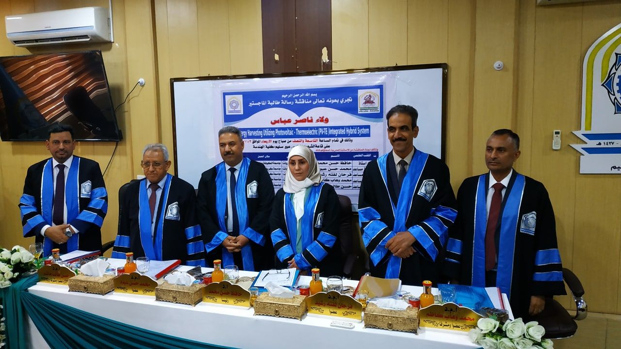 وتضمنت الرسالة التي حملت عنوان ” حصاد الطاقة الشمسية باستخدام النظام الهجين المتكامل (كهروضوئي PV – كهروحراري TE)” للطالبة ولاء ناصر عباس ، تطوير كفاءة الخلايا الشمسية باستخدام نظام هجين يستخدم حرارة الخلايا الشمسية الفائضة في توليد طاقة كهربائية من الخلايا الكهروحرارية في مرحلة ثانية.