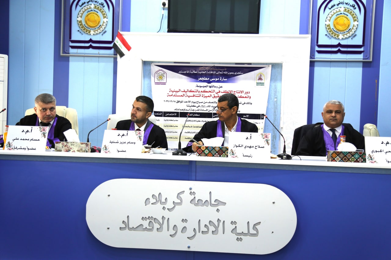 ناقشت كلية الإدارة والاقتصاد بجامعة كربلاء رسالة الماجستير الموسومة ( صيرفة الظل وأثرها في تعزيز استخدام المنتجات المالية – بحث تطبيقي في معمل إسمنت الكوفة ) للطالبة سارة موسى مطجعر .