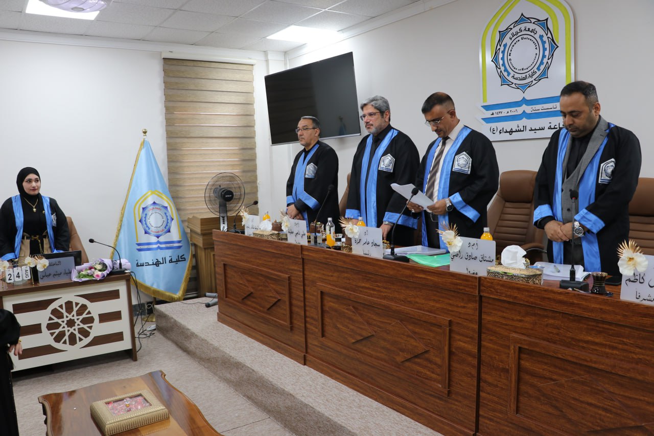 ناقشت رسالة ماجستير في كلية الهندسة بجامعة كربلاء (التصرف الانشائي للبلاطات ثنائية البعد الهجينة من الخرسانة والملاط النافذ بالالياف الحديدية تحت تأثير الاحمال الثابت) للطالبة علياء ميثم عباس.