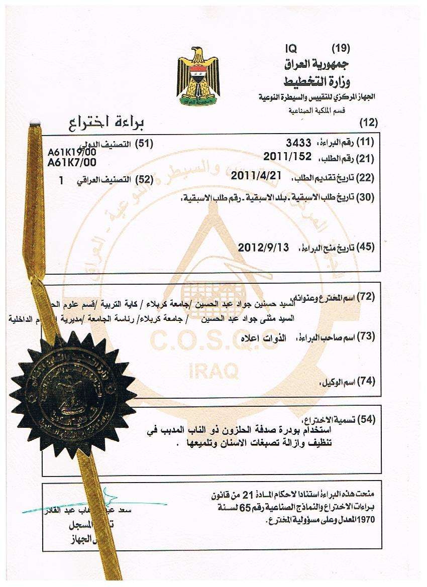 وحملت براءة الاختراع الأولى عنوان “استخدام بودرة صدفة الحلزون ذو الناب المدبب في تنظيف وإزالة تصبغات الأسنان وتلميعها”، إذ يمكن تصنيع هذه المادة بشكل باودر ومعجون، فيما حملت براءة الاختراع الثانية عنوان “تصنيع المادة العازلة المستخدمة في صناعة الأسنان من بذور نبات الكتان”، وهي عبارة عن مادة تخفف بالماء وتستخدم في عزل الطبقة الجبسية عن طقم الأسنان.