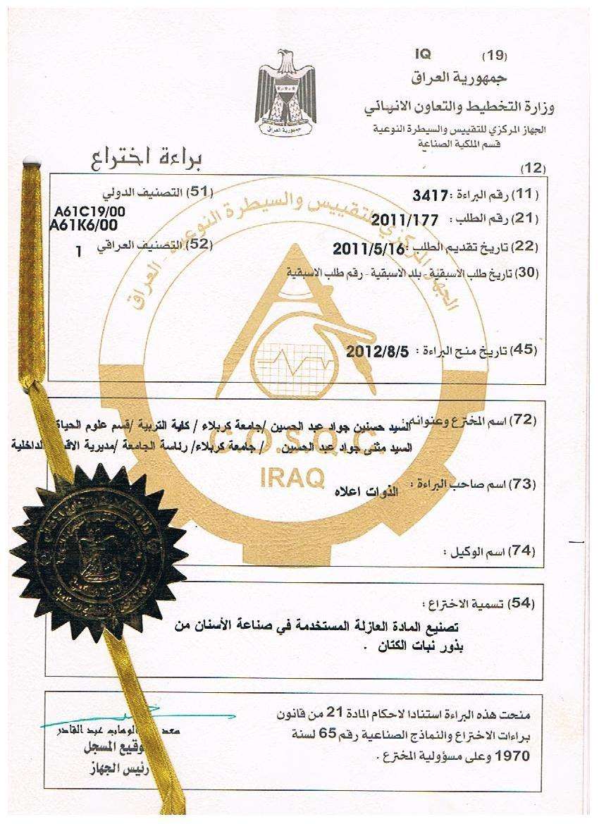 حصل باحثان الباحثان المدرس الدكتور حسنين جواد من كلية طب الأسنان والمدرس الدكتور مثنى جواد من كلية الصيدلة على براءتي اختراع من الجهاز المركزي للتقييس والسيطرة النوعية في مجال تصنيع مواد خاصة بطب الأسنان.