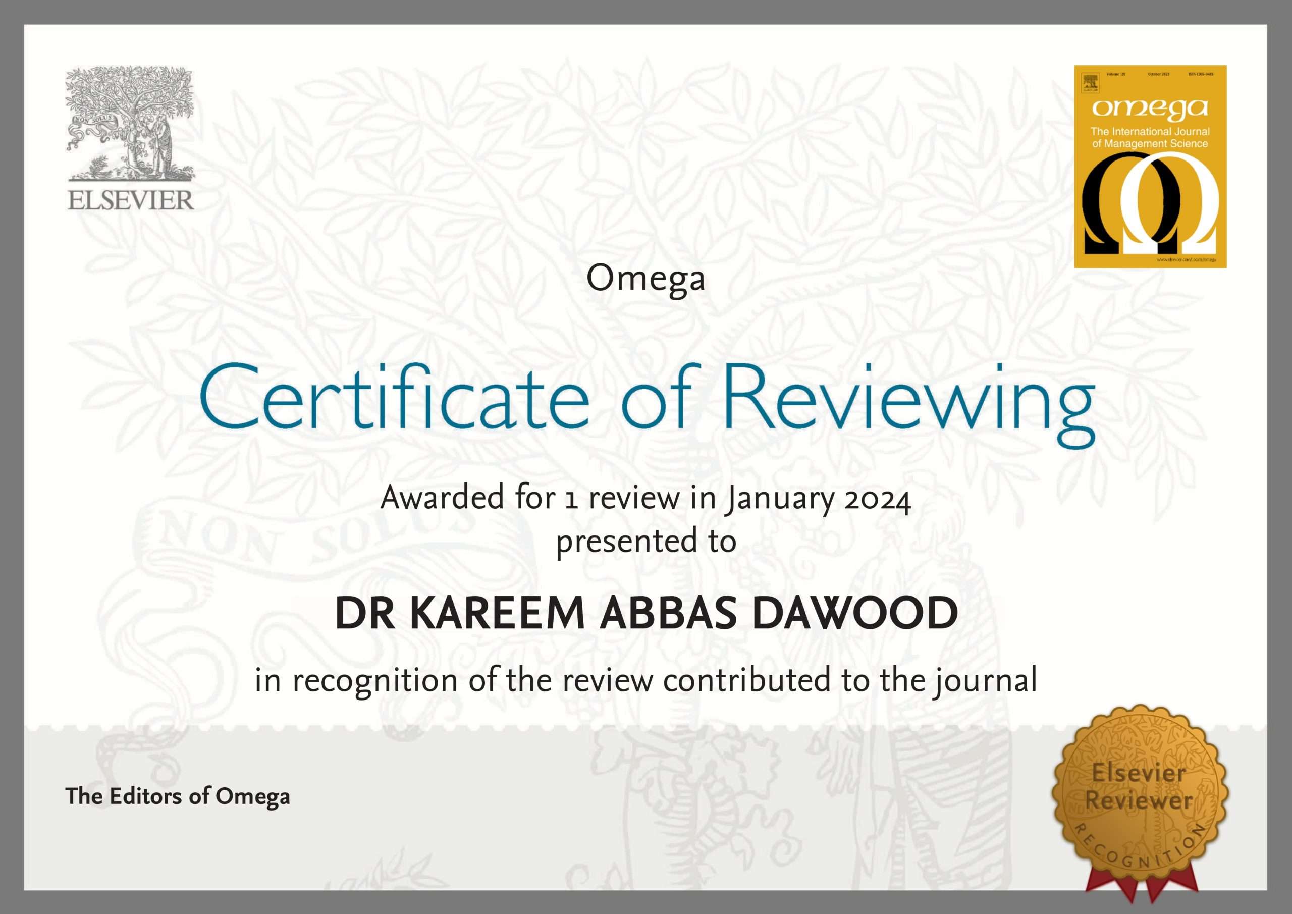 أعلنت مجلة “اوميكا” (Omega) البريطانية المختصة بعلم الإدارة عن اختيارها التدريسي في كلية طب الأسنان بجامعة كربلاء الدكتور كريم عباس داوود عضوا مقيما فيها.