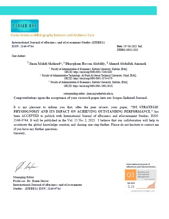 تمكن فريق بحثي من كلية الادارة والاقتصاد بجامعة كربلاء وبالتعاون مع باحث من الكلية التقنية الادارية بجامعة الفرات الاوسط من نشر بحث علمي في “المجلة الدولية لدراسات الاعمال الالكترونية والحكومة الالكترونية”.