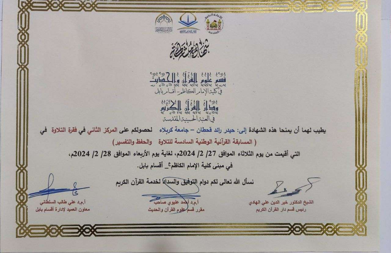 حصل طالب المرحلة الاولى حيدر رائد المهداوي من قسم علوم القرآن والتربية الإسلامية في جامعة كربلاء المرحلة الأولى الدراسة الصباحية على المركز الثاني على العراق في المسابقة القرآنية الوطنية السادسة للتلاوة والحفظ والتفسير.