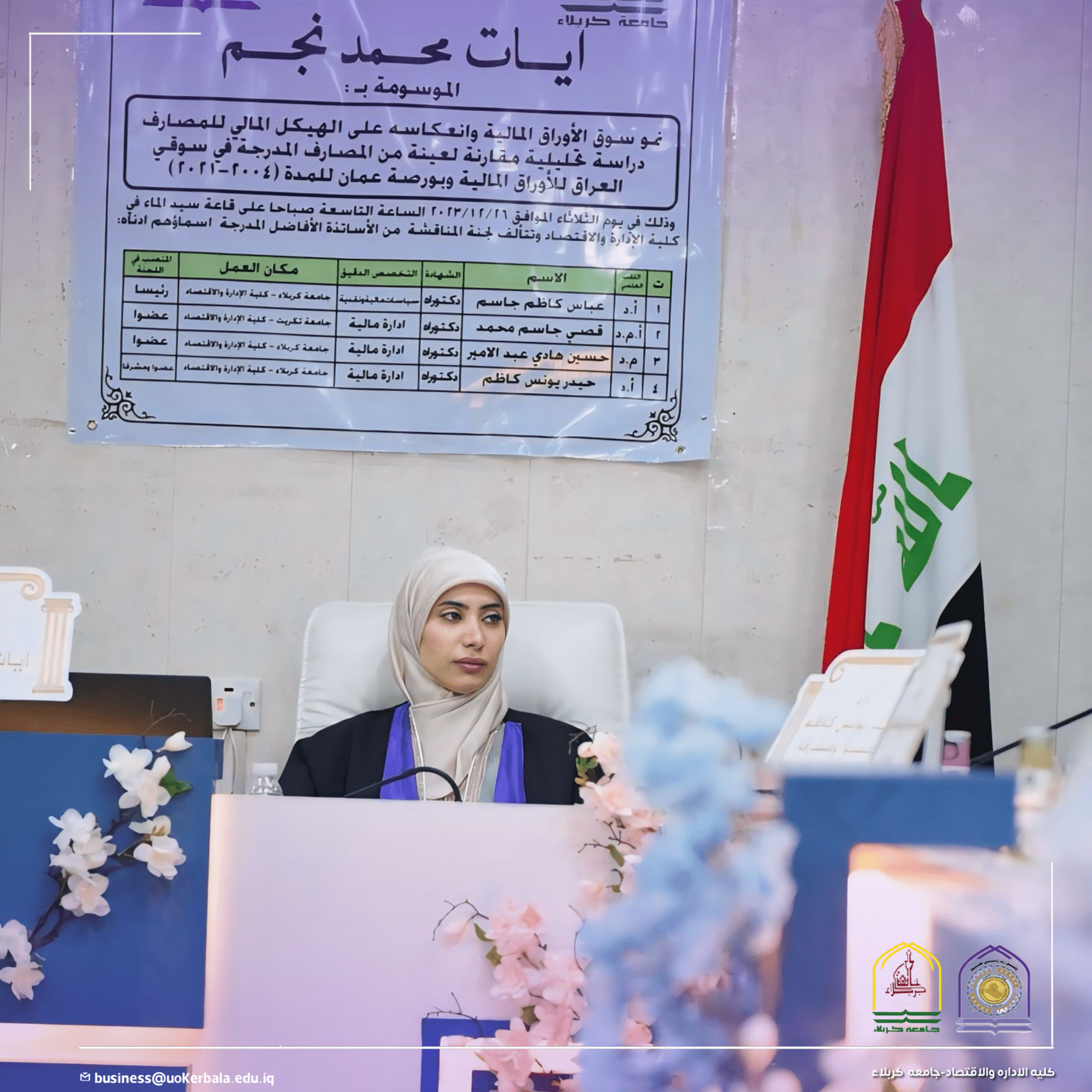 ناقشت رسالة ماجستير في كلية الإدارة والاقتصاد بجامعة كربلاء نمو سوق الأوراق المالية وانعكاسه على الهيكل المالي للمصارف-دراسة تحليلية مقارنة لعينة من المصارف المدرجة في سوقي العراق للأوراق المالية وبورصة عمان المالية للمدة (2004-2021).