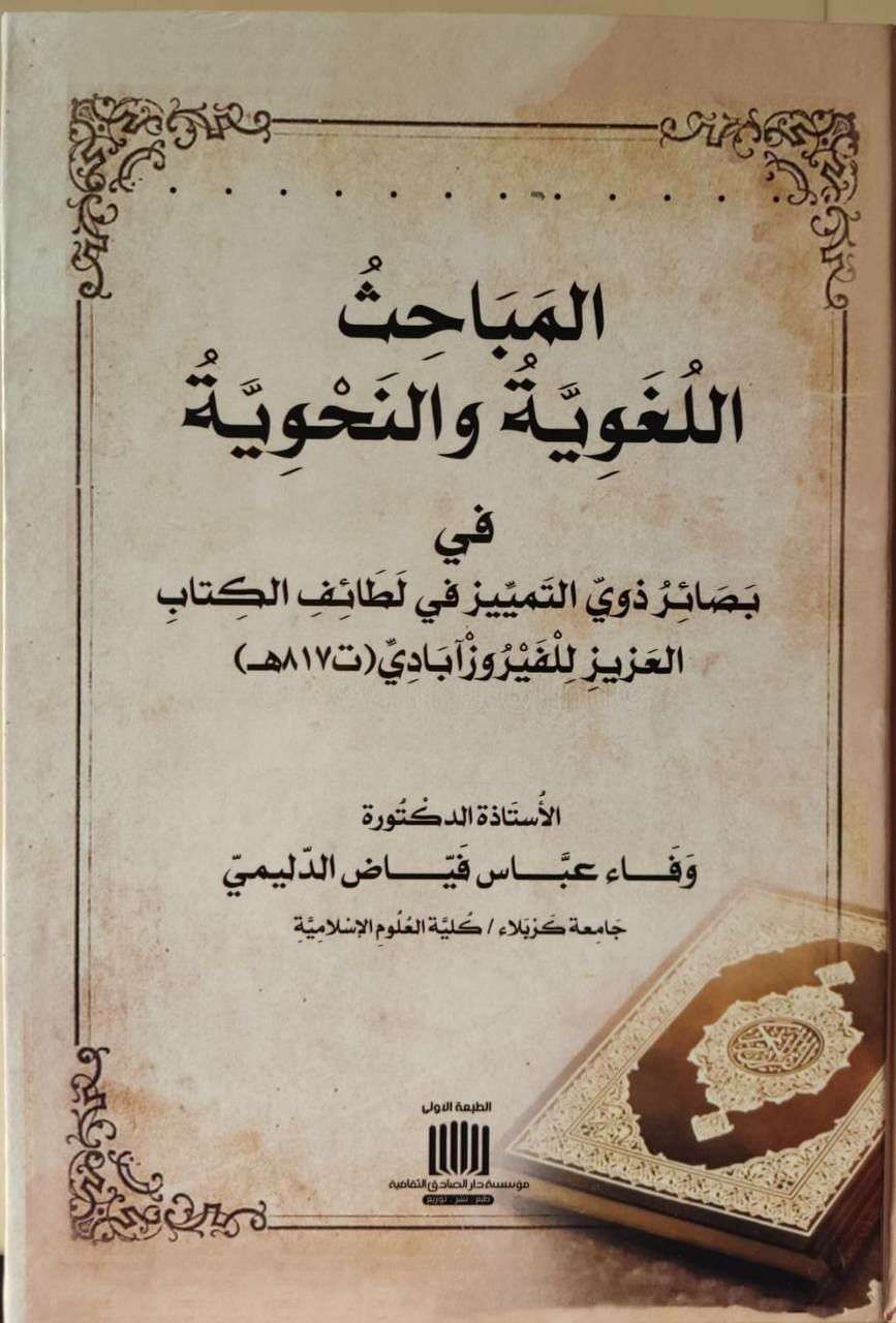 صدر للتدريسية في كلية العلوم الاسلامية بجامعة كربلاء الاستاذة الدكتورة وفاء عباس فياض كتاب حمل عنوان (المباحث اللغوية والنحوية في بصائر ذوي التمييز في لطائف الكتاب العزيز للفيروزآبادي ( ت٧١٨هجرية)، عن مؤسسة دار الصادق الثقافية.