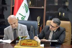 وقع الدكتور أحمد شاكر سلمان عميد كلية القانون في جامعة كربلاء آلية تعاون علمي مشترك مع عميد كلية القانون في جامعة وارث الأنبياء الدكتور علي صاحب الشريفي.