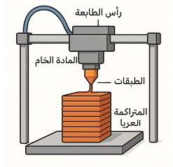 صورة 1: رسم توضيحي لمبدأ عمل الطابعة ثلاثية الأبعاد (رأس الطابعة، المادة الخام، الطبقات المتراكمة)