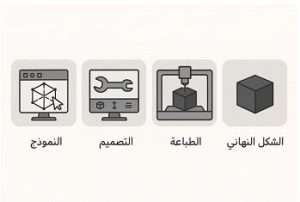 صورة 3: تسلسل مرئي لخطوات التصميم والطباعة بدءًا من النموذج حتى الشكل النهائي