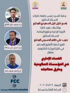 برعاية رئيس جامعة كربلاء الاستاذ الدكتور باسم خليل نايل السعيدي وباشراف مباشر من قبل عميد كلية التربية البدنية وعلوم الرياضة الاستاذ الدكتور حبيب علي طاهر اقامت شعبة التعليم المستمر بالكلية ورشة الالكترونية بعنوان الفساد الإداري في المؤسسات الحكوميه وطرق معالجته وذلك عن طريق منصة fcc الالكترونية ،شارك فيها عدد كبير من اساتذه الجامعات والموظفين وطلبة الكليات في العراق ،