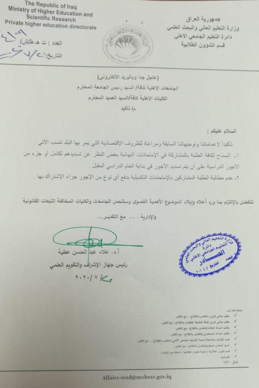 وحسب الكتاب العاجل الصادر بإمضاء رئيس جهاز الإشراف والتقويم العلمي الأستاذ الدكتور علاء عبد الحسن عطية فقد تقرر السماح لجميع الطلبة في الجامعات والكليات الأهلية بالمشاركة في الامتحانات النهائية بغض النظر عن عدم استكمال تسديد الأجور الدراسية وإعطاء المرونة الكافية بتأجيل التسديد حتى بداية العام الدراسي المقبل.