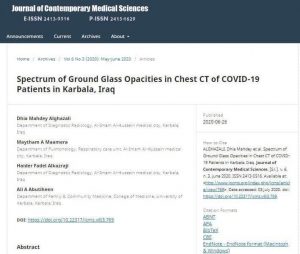 نشر الدكتور علي عبد الرضا ابو طحين التدريسي في كلية الطب بجامعة كربلاء بحثاً علمياً مشتركاً مع مجموعة من اطباء في محافظة كربلاء المقدسة / مستشفى الحسين التعليمي بعنوان “طيف عُتم الزجاج المطحون في صور المفراس الحلزوني لمرضى كوفيد-١٩ في كربلاء العراق”