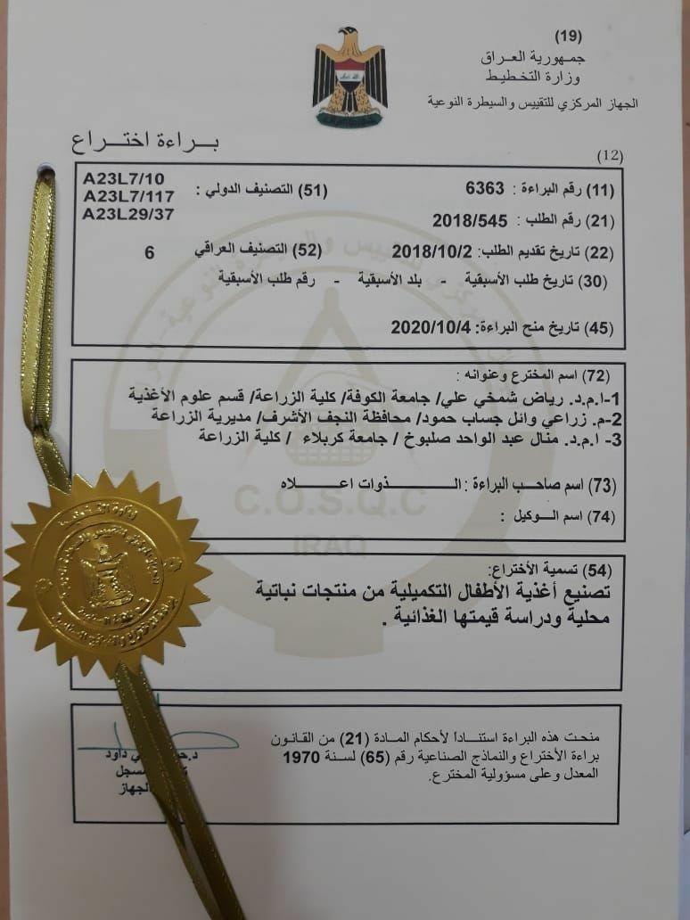 حصلت الدكتورة منال عبد الواحد صلبوخ التدريسية في كلية الزراعة بجامعة كربلاء على براءة اختراع حول تصنيع أغذية الأطفال التكميلية من منتجات نباتية محلية ودراسة قيمتها الغذائية ، بالاشتراك مع الأستاذ الدكتور رياض شمخي الموسوي من جامعة الكوفة والمهندس وائل جساب حمود من زراعة النجف ,