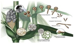 Ustilago maydis belongs to the Basidiomycota phylum, class Ustilaginomycetes. It is a dimorphic fungus, alternating between a saprophytic yeast-like phase and a pathogenic filamentous form [8].Infection occurs when diploid teliospores germinate, producing haploid sporidia that fuse to form infectious dikaryotic hyphae, these hyphae penetrate maize tissues, inducing tumor formation [9].