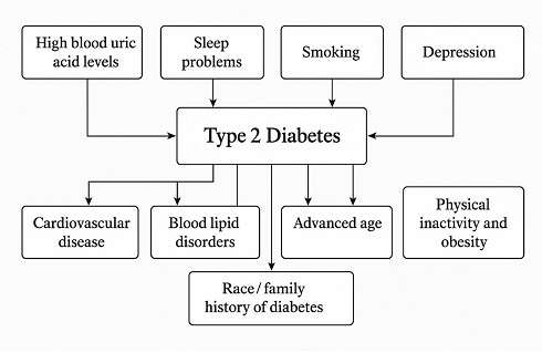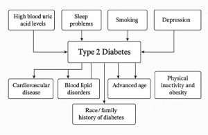 Type 2 diabetes is the result of an interaction of several factors including lifestyle, health status, genetics, psychosocial aspects, and demographic characteristics. These factors include high blood uric acid levels, problems with sleep quality and quantity, smoking, depression, cardiovascular disease, blood lipid disorders, high blood pressure, advanced age, race, family history of diabetes, in addition to physical inactivity and obesity [5].
